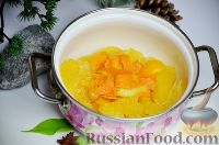 Апельсины чистят: снимают и пленку, и белый слой кожуры. В кастрюлю кладут очищенные дольки и тонкую оранжевую кожуру.