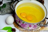 Добавляют два желтка и один белок. Сырой курд 2-3 минуты взбивают венчиком блендера на высокой скорости.