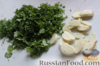 Присыпать первый слой помидоров солью, посыпать чесноком, тмином и зеленью.