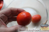 (Чтобы быстро очистить кожицу помидоров, надо сделать крестообразный надрез по попке помидора, сложить в миску и залить кипятком, оставить примерно на минуту. Слить кипяток, обдать холодной водой. Теперь кожица снимется быстро.)