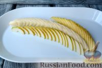 Затем идет перо петушиного хвоста, выложенного из тонко нарезанного яблока с яркой красной кожурой.