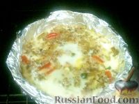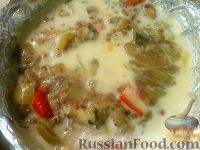 Форму застелить фольгой. Выложить смесь овощей с кашей, слегка утрамбовать. Залить подготовленной молочно-яичной смесью.