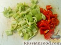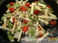 На сковороде разогреть масло. Выложить овощи. Жарить их до мягкости, помешивая. Посолить.
