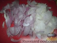 Лук (у меня одна красная луковица и одна белая, но можете выбрать любой лук) нарезать тонкими полукольцами.