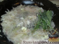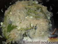 Лук обжариваем на растительном масле до прозрачности, на маленьком огне, с добавлением ароматных трав и чеснока. Если нет свежих, используйте сушеные.