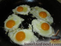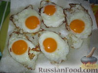 Яйца пожарить на большом количестве растительного масла. Так, чтобы каждое яйцо было отдельно. Желток должен остаться непрожаренным (желательно).