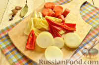 Подготавливаем остальные овощи. Очищаем морковь и лук. С болгарского перца удаляем семена. Морковь и лук нарезаем в форме колец, перец — в форме полосок.