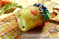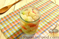 Наполняем банки кубиками кольраби и нарезанными овощами.