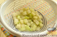 Кубики кольраби бланшируем в кипящей воде 2 минуты. Воду присолите из расчета на 1 л – 2 чайных ложки соли. После бланшировки кубики кольраби переправляем в дуршлаг и обдаем холодной водой.