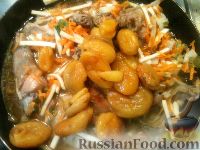 Затем в сковороду влить 4 стакана жидкости, в которой мариновался кролик и коренья, добавить 8 ст. л. воды и довести на слабом огне до кипения. Тушить еще 10 минут.