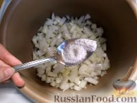 Добавьте соль и соду (сода в блюде чувствоваться не будет, она нужна для смягчения лука). Распределите соль и соду равномерно по всему луку.