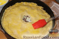 Отделить желток от второго яйца, слегка его в злить и намазать сверху пирог для получения красивой аппетитной корочки.