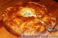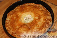 Выпекать курник 45 минут. За 15-20 минут до готовности влить в отверстие 2 ст. л. воды. Выпекать курник далее до золотистой корочки.