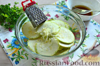 Промываем молодые кабачки под проточной водой, обтираем. Нарезаем на очень тонкие кольца (в идеале лучше использовать специальную шинковку).