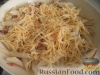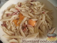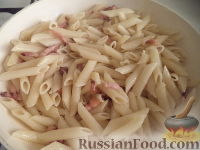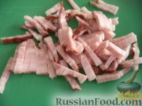 Разогреть в сковороде оливковое (или другое растительное) масло, обжарить в нем чеснок 1 минуту, помешивая. Добавить бекон. Обжаривать, помешивая, на среднем огне примерно 3 минуты.