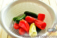 Овощи хорошо промываем под проточной водой. Помидорчики и огурцы оставляем целиком. А вот со сладкого болгарского перца удаляем семенную коробочку.
