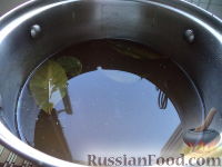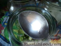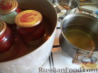 Для стерилизации также можно применить следующий способ: банки с овощами или фруктами опустить в емкость с холодной водой. Уровень воды должен доходить до плечиков банки. Чтобы банки не поднимались, поставить на них гнет. Вынуть банки, как только закипит вода в кастрюле. Рядом на плите должен кипеть рассол, разлить его по банкам.