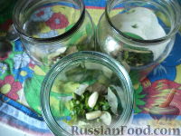 Банки хорошо промыть. В подготовленные банки на дно положить нарезанную зелень, кусочек горького перца, чеснок.