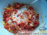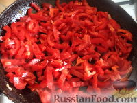 В сковороду долить масло выложить перец. Обжарить, помешивая, на среднем огне 5-7 минут.