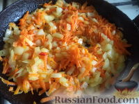 сковороду разогреть, налить растительное масло. Выложить лук и морковь. Обжарить, помешивая, на среднем огне до прозрачности лука (около 5-7 минут). Выложить овощи в миску.