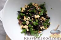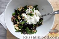 Чернослив режем кубиком, петрушку мелко шинкуем — соединяем, всыпаем дробленый грецкий орех.