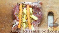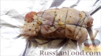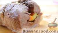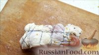 Заворачиваем свинину по типу рулета. Перевязываем мясо очень плотными нитками (см. видео).