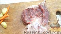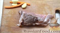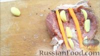 Морковь и чеснок очищаем. Морковь нарезаем длинной соломкой, каждый зубчик чеснока разрезаем на 3 кусочка.