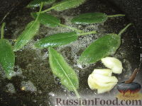 На сковороде с антипригарным покрытием прогреть сливочное и оливковые масла. Подрумянить раздавленную дольку чеснока и листочки шалфея.