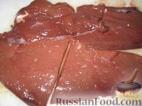 Печень промыть и вырезать белые, жесткие волокна. Подсушить салфетками.
