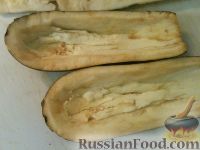 Баклажаны вымыть, срезать хвостики, вырезать мякоть, оставляя бортики 0,5 см.