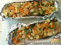 Баклажаны завернуть в фольгу, наполнить начинкой.