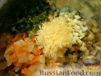 Лук, морковь, серединки баклажанов, зелень, перец и половину сыра соединить и перемешать. Посолить.